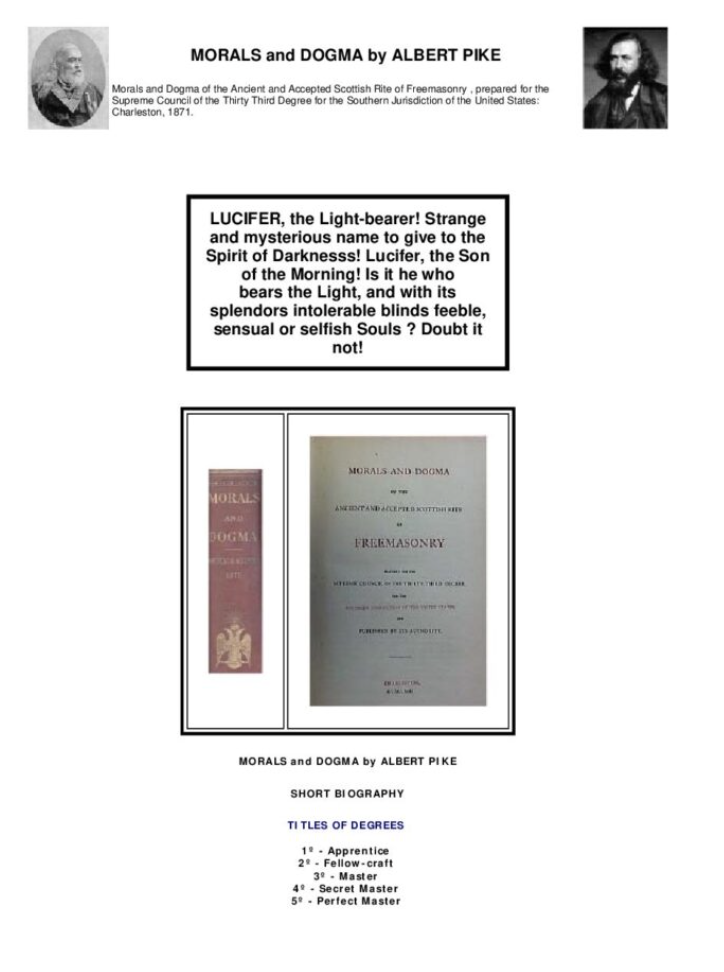 Opmerking: Dit godslasterlijke boek Morals and Dogma van Albert Pike de ‘Plato’ van de Vrijmetselarij is nuttig om de godslasterlijke aard van de Vrijmetselarij aan te tonen. Eenmaal gedownload en geopend zoek je naar Lucifer en dan naar Adonai. Als je het gaat doorlezen stel ik voor dat je voor elke pagina die je leest je geest reinigt met een paar pagina’s uit de Schrift.